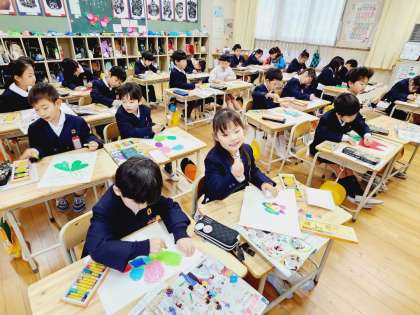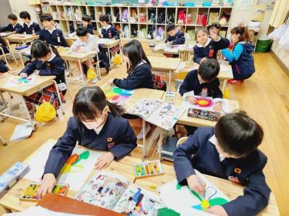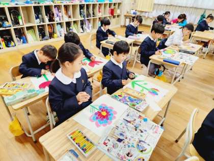 今日は、新1年生を迎える歓迎の準備と卒業する6年生に感謝の気持ちを込めて、みんなで“お花”の絵を描きました。みんな、春らしい、見ているだけで心がうきうきするような絵を気持ちを込めて描きましたよ!