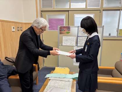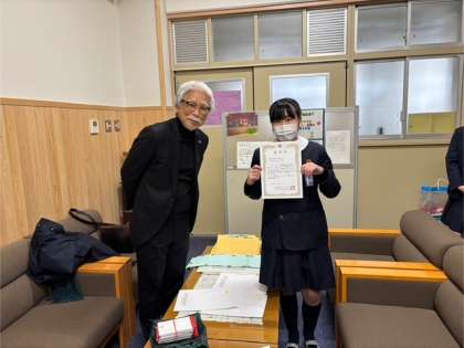 ライオンズクラブの方々にお越しいただき、「国際平和ポスターコンテスト」で優秀な作品を描いた児童の表彰が行われました。