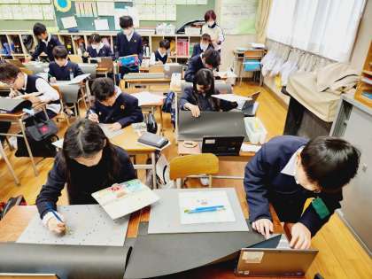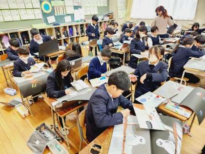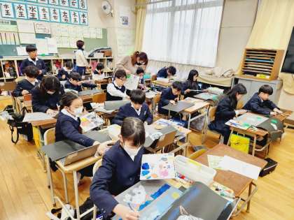 図画工作の時間に「一版多色刷り版画」に取り組んでいる4年生。