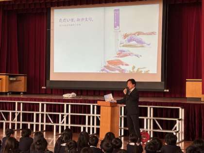 今日の朝会では、ギャラリー表彰の後、「ただいま、おかえり。3.11からのあのこたち」という写真絵本の写真を見ながら、震災についてのお話がありました。