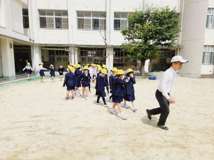 先生引率のもと、子どもたちはすばやく運動場に避難することができました。