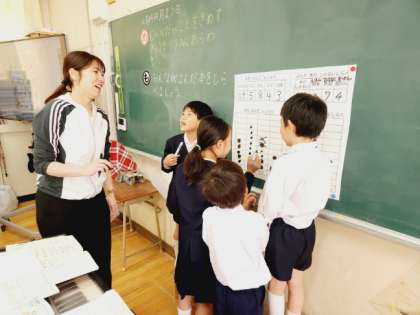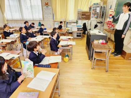 国語や算数の授業が進んでいます。担任の先生の手には、アシスタント?のお人形さんが…!みんな楽しく学習に取り組むことができています!