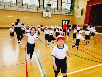 今日は体育館で、1年生が小学校ではじめて体育の授業を受けました。