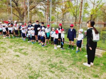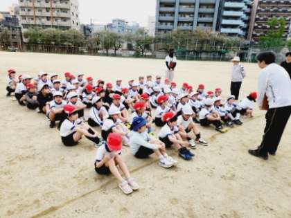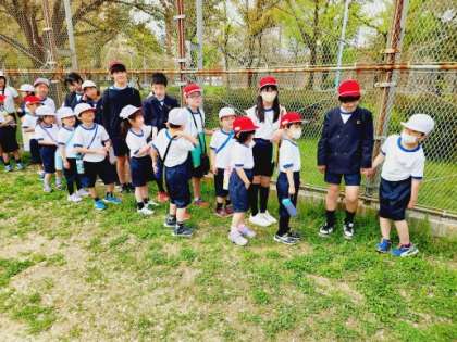 各学年が本庄グラウンドに集合し、順次計測を行っていきますが、毎年1年生は6年生のおにいさん・おねえさんに手をつないでもらって、本庄グラウンドまで来ます。