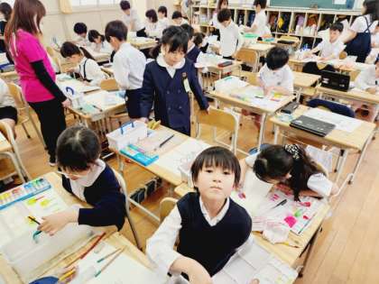 2年生の時に水彩絵の具の特徴や扱い方など、基本的な学習はしていますが、今日は着色の仕方などのおさらいをしながら、活動をすすめました。