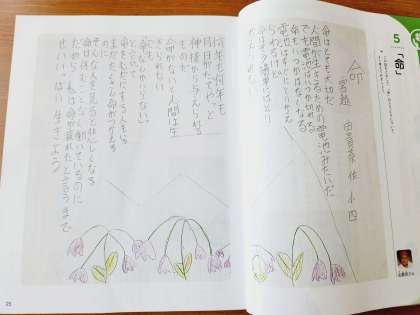 この詩を書いた4か月後になくなりましたが、これに書いたとおり、じゅうぶんせいいっぱいに生きました。書くことがそんなに得意ではなかったむすめの、この「命」という詩は、11年という短いけれどもぎょうしゅくされた人生の中で得た、勉強の成果なのではないかと思います。