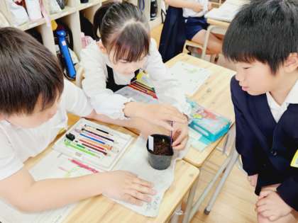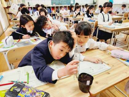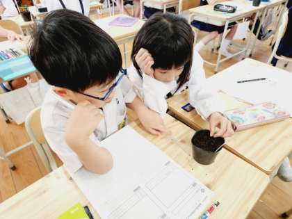 3年生が理科の時間に、自分たちで種をまいたマリーゴールドの観察をしていました。