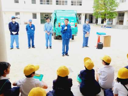 4年生は今日、大阪市環境局の皆様にお越しいただき、「パッカー車体験」の学習を行いました。