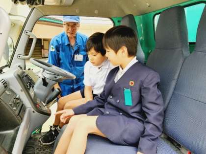 運動場にパッカー車を置いていただき、パッカー車の説明やごみを回収するときの注意点など、実際に働いている方にしか分からないことをたくさん教えていただきました。