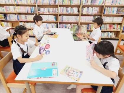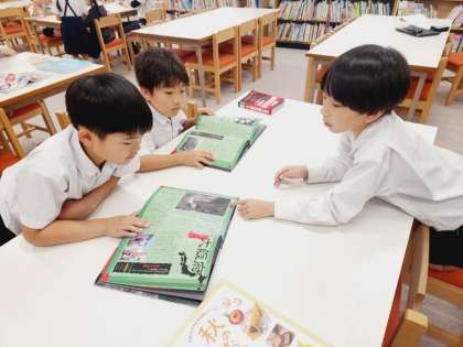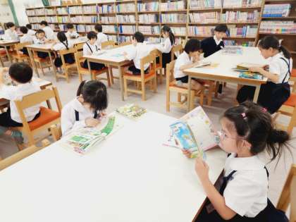 各学年で時間を見つけて、図書室に行って本を読む時間をつくっています。