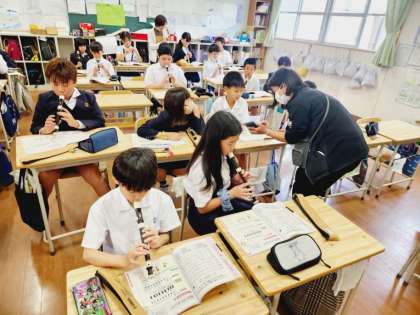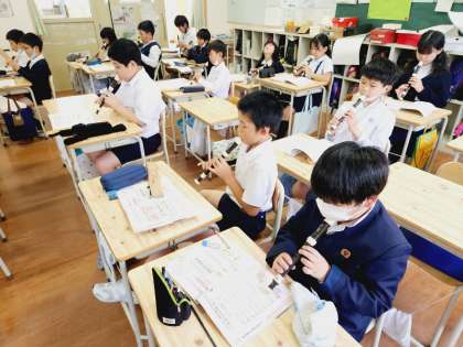 5年生が音楽の時間に「小さな約束」という曲をリコーダーで演奏していました。