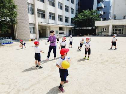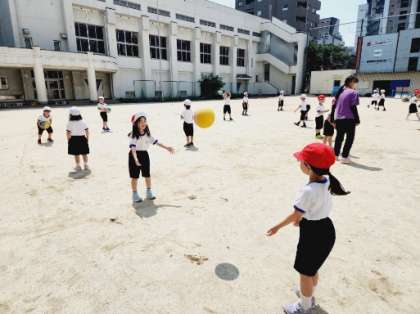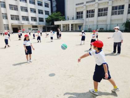 昨日は1日雨で、運動場を使うことができませんでしたが、今日は気持ちよく晴れわたり、1年生が運動場でボールあそびうんどうをしていました。