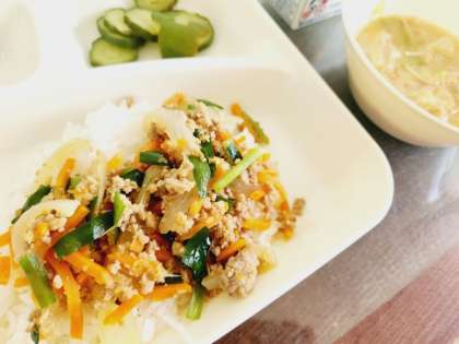 「豚ひき肉とにらのそぼろ丼」は、豚ひき肉とにら、たまねぎ、にんじんを使ってしょうがやにんにく、しょうゆやさとうなどを使って味付けした具材をごはんにかけていただきます。とても食べやすく、子どもたちからも大人気の献立でした!