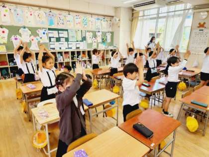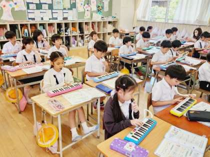 クラスみんなで音楽を使ったじゃんけんゲームを楽しんだあと、歌と鍵盤ハーモニカの練習をしました。