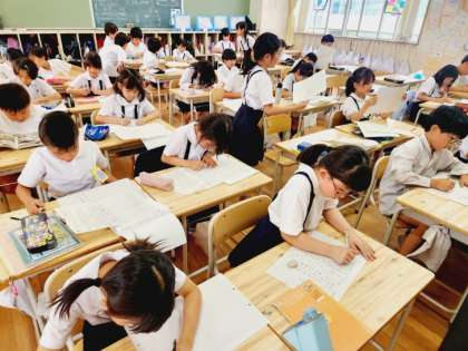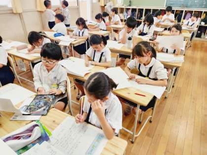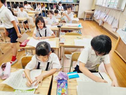 国語の時間に自分のことをみんなに知ってもらうために、自分の説明文を書いている3年生。