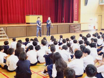今日の全校朝会は、北区役所から「あんまち隊」の方にお越しいただき、交通安全についてお話をしていただきました。
