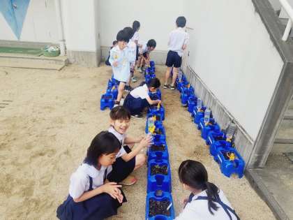 全校朝会のあとは、低学年の子たちを中心に学習園や植木鉢へお水やりをしていました。