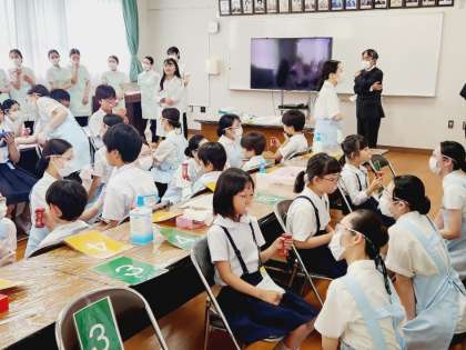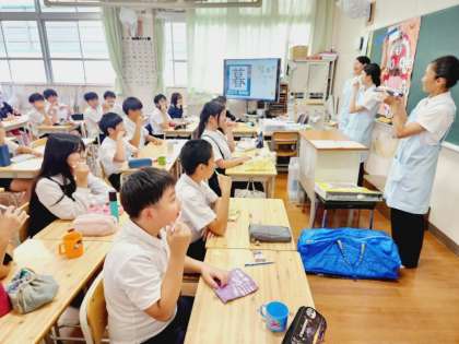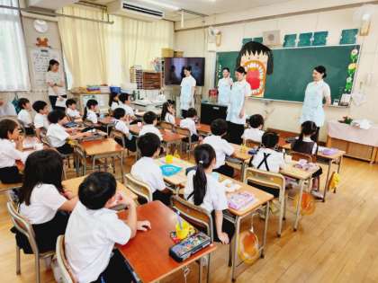 校医さんと歯科衛生士さん、歯科衛生士の実習生さんが来られ、子どもたちへ歯みがきの指導をしていただいたあと、フッ化物塗布が行われました。