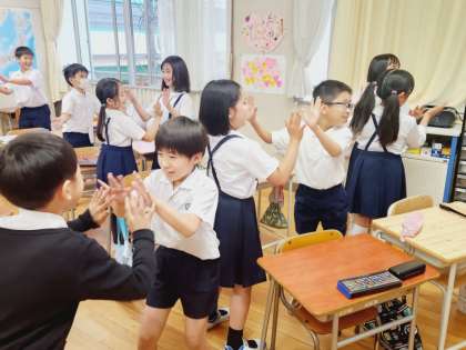 歌の練習では、みんなの声が出やすいように振り付けをつけて、リコーダーの練習では大型ディスプレイに映しだされる映像に合わせて演奏をしていました。