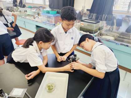学校の池の水やバケツ苗の水を採取し、けんび鏡を使ってどんなものが見えるか観察していきます。