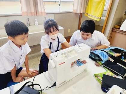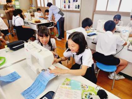 家庭科の時間に「裁縫」の学習をしている5年生。