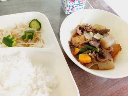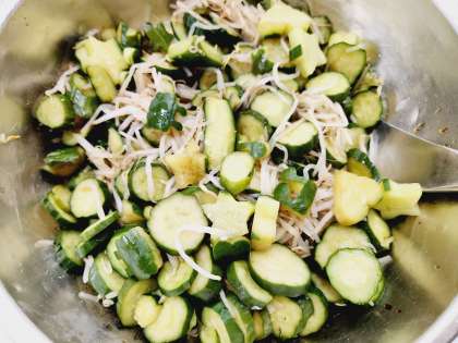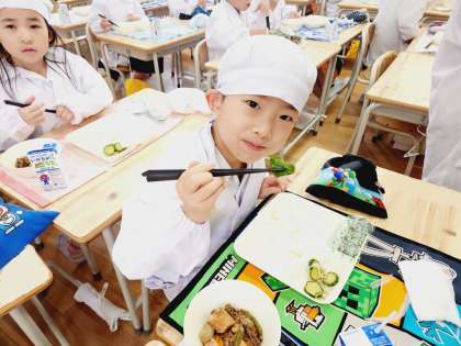 今日も給食調理員さんが工夫を凝らして、夏の新作!「かにさん」と「🎵」の形をはじめ、さまざまな形の「ラッキーきゅうり」を入れてくださいました!