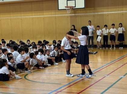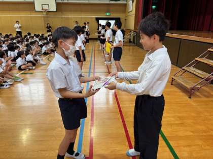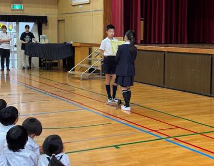 110周年記念式典のキャラクターの衣装デザインコンテストで、1位に選ばれた児童への表彰がありました。カラフルで素敵な衣装が選ばれました。