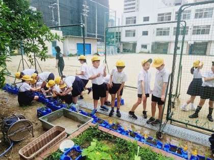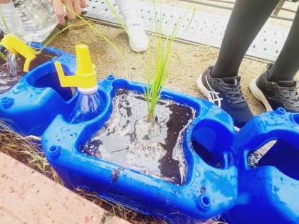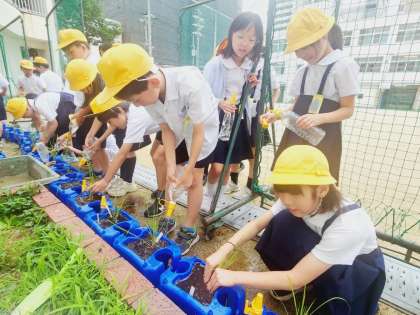 3年生が植木鉢を使った稲の苗植えを行いました。