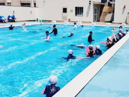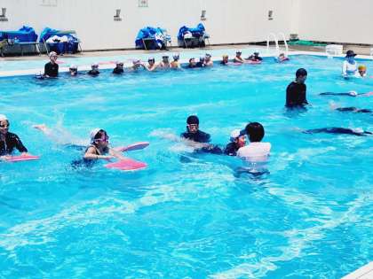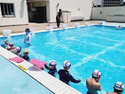 豊崎小学校では毎年1学期の水泳指導の期間中に、水泳指導専門のコーチにお越しいただき、指導を受けます。