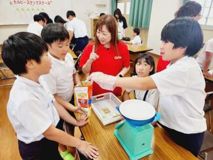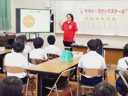 カルビーの方にお越しいただいての出前授業、6年生では「おやつのとり方」について教えていただきました。