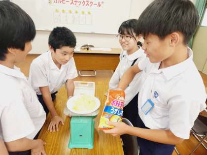 「おやつ」を食べる量やカロリー、食塩や脂質などの成分など、「おやつ」を食べる際に気をつけなければならないことを、ポテトチップを例にとりながらみんなで学習しました。