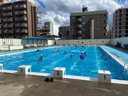 屋外運動クラブは、プールでポートボールの試合をしていました。