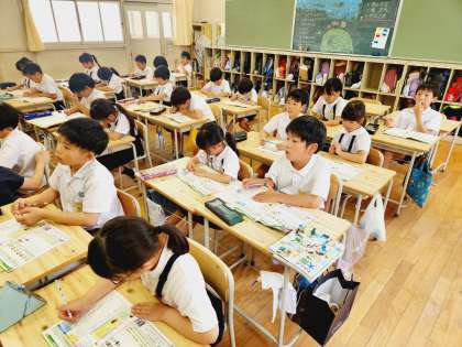 学習の手引きを見て、どのように書くのかを学んだあと、実際に「暑中見舞いはがき」を書いて郵便で届けます。