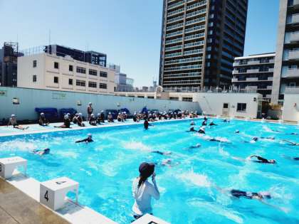 今日は豊崎小学校のプールで、豊崎本庄小学校と豊崎小学校の5年生が「交流水泳」を行いました。