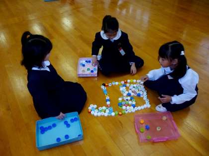 1年生の図画工作科の授業です。ペットボトルのキャップをたくさん並べたり,積んだりしていろいろなものをつくりました。