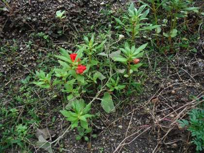 ふと見ると,赤い花が…あれっ,ホウセンカ?