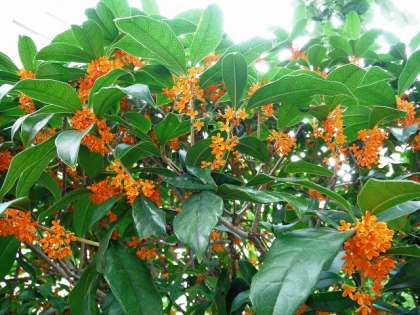 オレンジ色の集まって咲く小さな花と、濃い緑の葉の対比も鮮やかで美しいです。