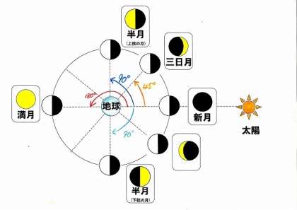月の近くに四角で囲んだ図が,太陽の位置関係で見え方が変わる月です。