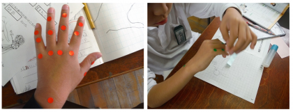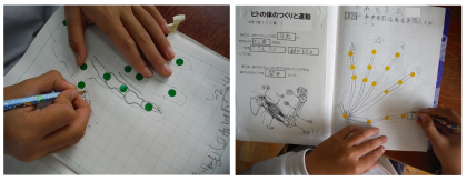 シールが何枚必要か貼りながら考えていると,14枚という意見と15枚という意見。さらに16枚という意見も出てきました。親指にも関節が3つあることや,手首も曲がるから関節だと気付き,みんなに教えていました。