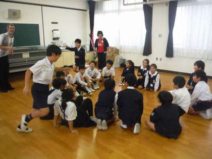 また,円になって集まり,「ドラえもん・ドラえもん・ピカチュウ」ゲームをしました。ピカチュウと肩を叩かれたときに,叩いた相手を追いかけ,楽しんで活動していました。