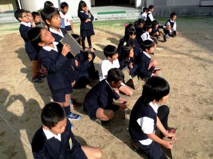 自分たちで画用紙に描いた的に,平面鏡で反射させた日光を当てました。たっぷりと時間をとって活動したので,子どもたち自身がさまざまな発見をすることができました。