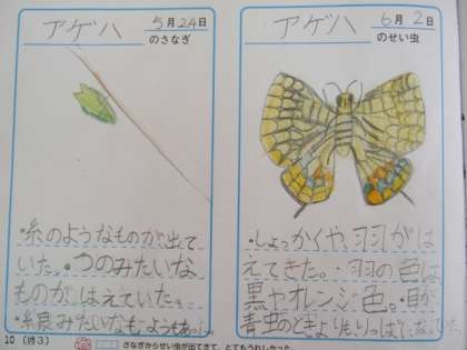 たまごから育てたアゲハは、次々とふ化して3匹とも元気に空へ飛んで行きました。子どもたちは大喜びで拍手で見送りました。その後、せい虫になったアゲハの体を描きました。