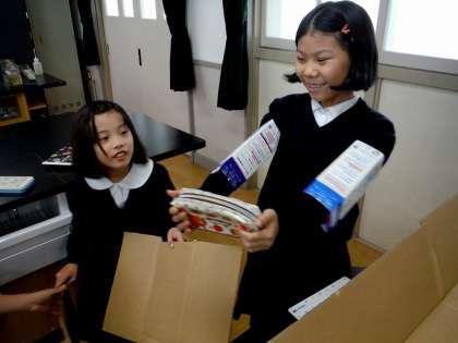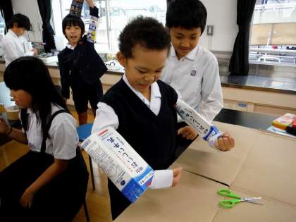 理科の時間に,牛乳パックや段ボール箱で関節をひじや膝にはめて,関節を固定しました。