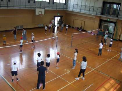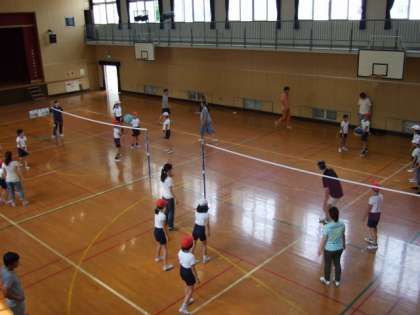 5年生は、講堂で、保護者の方とソフトバレーボールをしました。最初はなかなかラリーが続かなかったですが、だんだんとバレーボールらしくなったかな?!