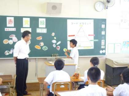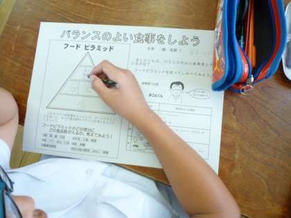 栄養バランスピラミッドを使って、一日の食事のバランスを考えました。赤・黄・緑に分けてバランスの良い食事にするにはどうしたらよいのか、活動を通して学びました。