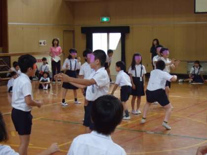 目隠しをした児童をまわりで誘導して、捕まえるゲームです。