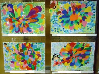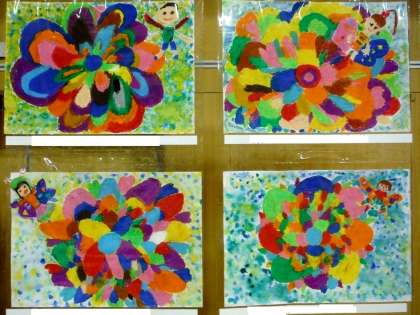 カラフルで大きいふしぎな花がさきました。花のいいかおりにさそわれて,かわいいようせいたちもやってきました。