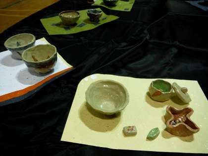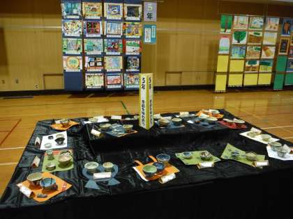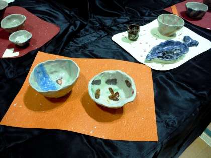 生涯学習ルーム陶芸教室の山名恭子先生に指導していただき制作した器です。絵の具を使って季節を表すために,どんな色彩を使うか工夫しました。器は調理実習のときにも活用する予定です。