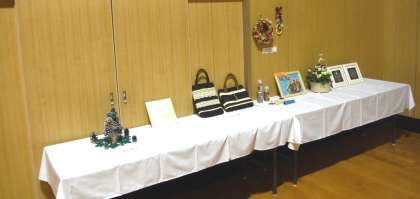 チョコレート細工やブリザーブドフラワー・寄せ植え・曼荼羅の点描画・手提げ鞄・手作り絵本・松ぼっくりを組み合わせてつくったクリスマスツリーなどの作品がありました。