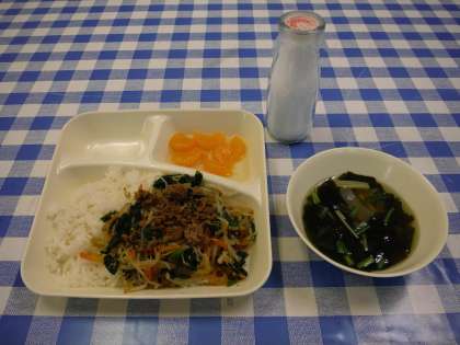 今日の給食は,비빔밥(ビビムパプ)と미역국(ミヨック=わかめスープ)でした。
